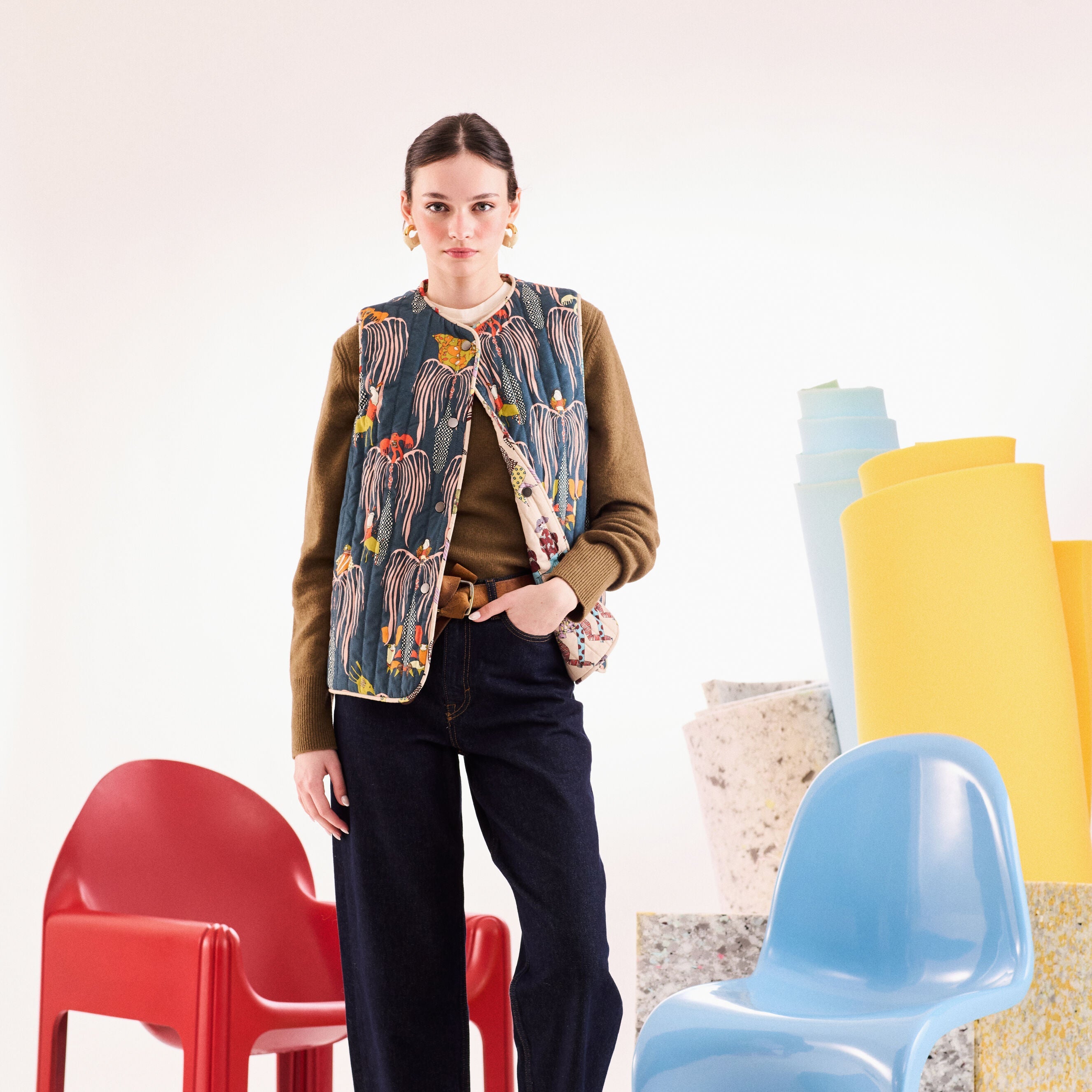 - %100 cotton, double-sided, quilted vest with hidden side pockets & rounded side slits.