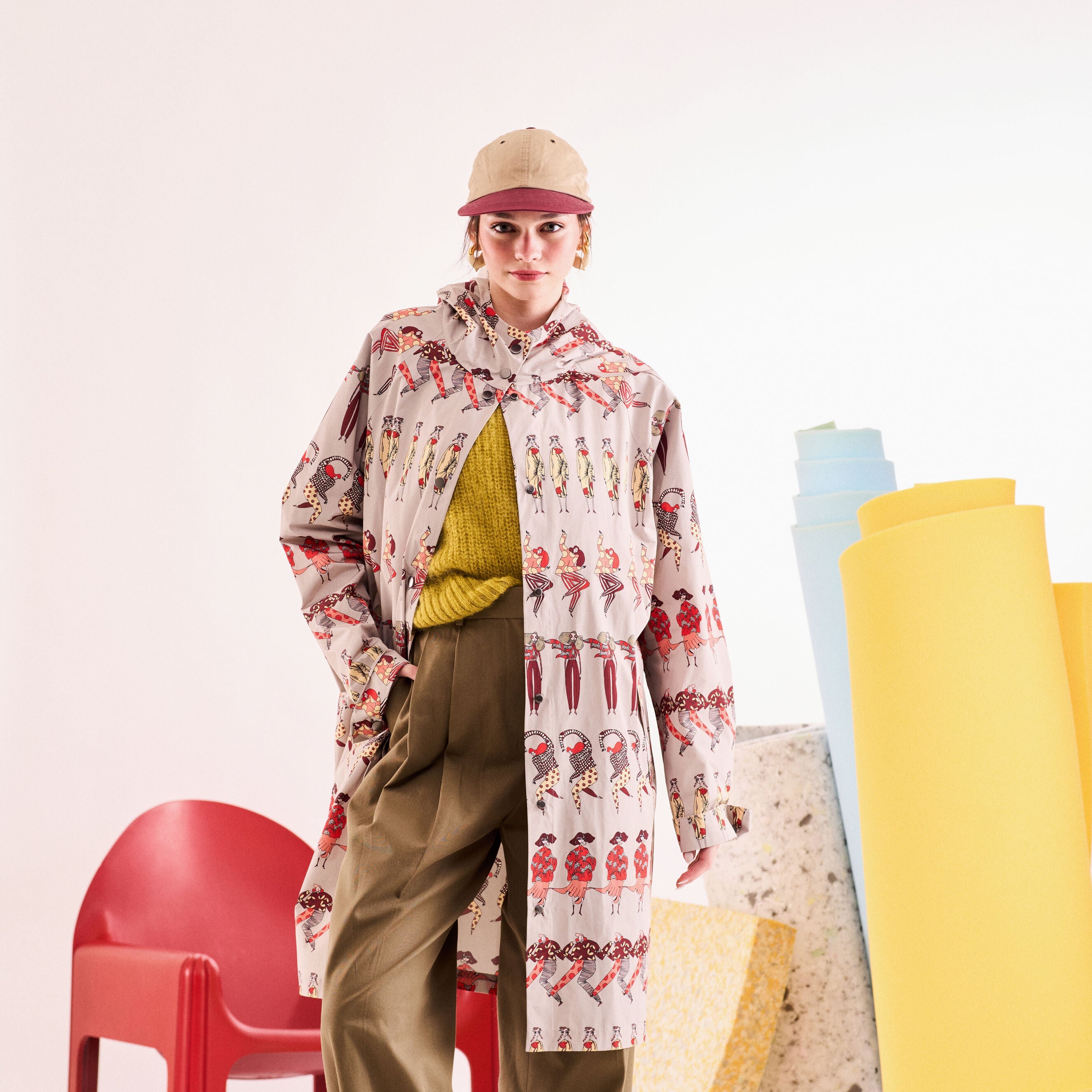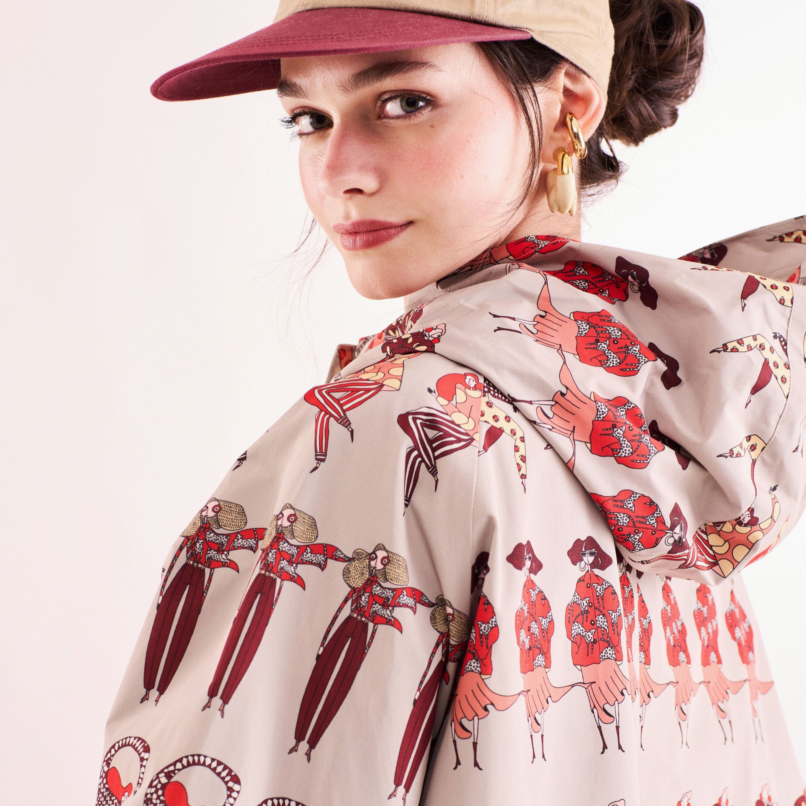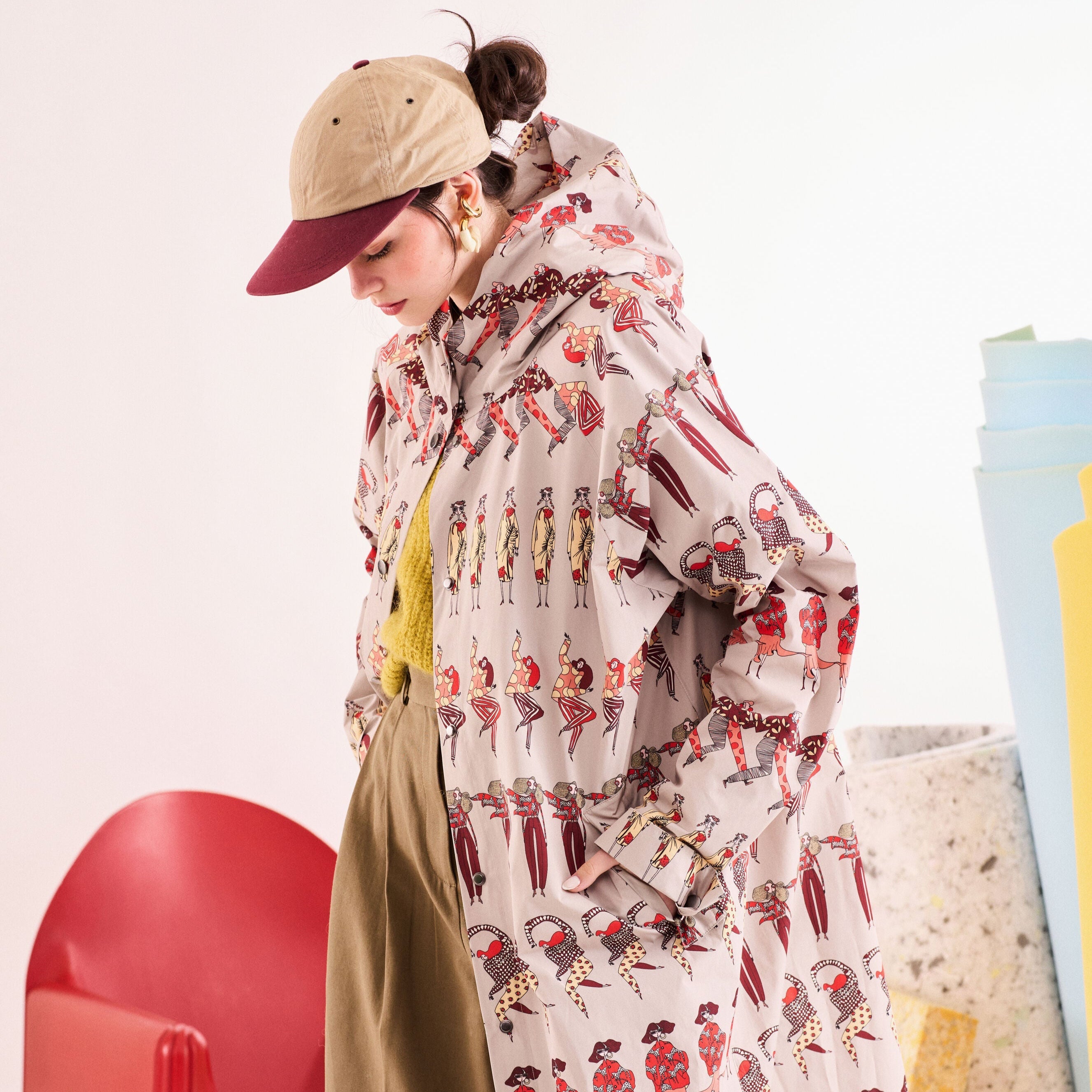 - %80 polyester, %20 cotton, loose fit raincoat with raglan sleeves, metal snap closures, and hoodie lined with self fabric. Each raincoat comes with it’s own envelope shaped bag in original print&fabric.