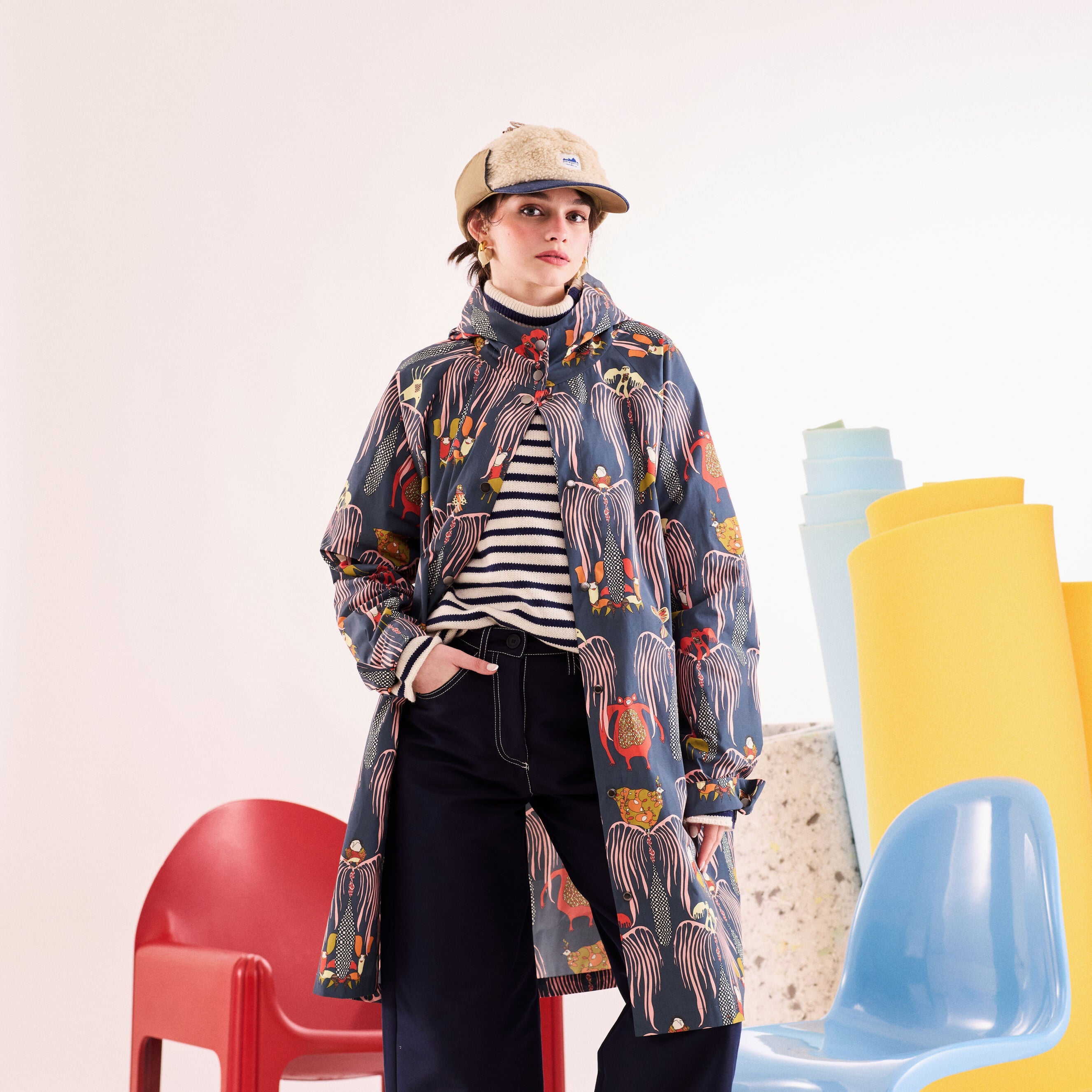 - %80 polyester, %20 cotton, loose fit raincoat with raglan sleeves, metal snap closures, and hoodie lined with self fabric. Each raincoat comes with it’s own envelope shaped bag in original print&fabric.